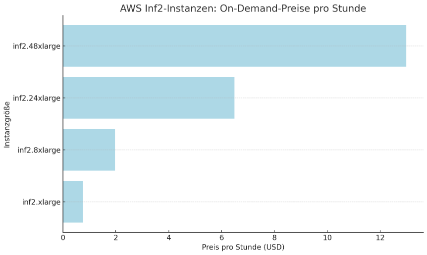Beispielhafte Preise für Inf2-Instanzen in der AWS-Region US East (Nord-Virginia) reichen von 0,76 USD pro Stunde für eine inf2.xlarge-Instanz bis zu 12,98 USD pro Stunde für eine inf2.48xlarge-Instanz, je nach Konfiguration. AWS bietet auch die Möglichkeit, Geld zu sparen, indem Sie 1- oder 3-jährige Reservierungen abschließen. Kundenbewertungen zeigen, dass der Einsatz von Inf1- und Inf2-Instanzen im Vergleich zu herkömmlichen GPU-basierten Lösungen verbesserte Leistung pro Inferenz sowie erhebliche Kosten- und Latenzzeiten verringert.