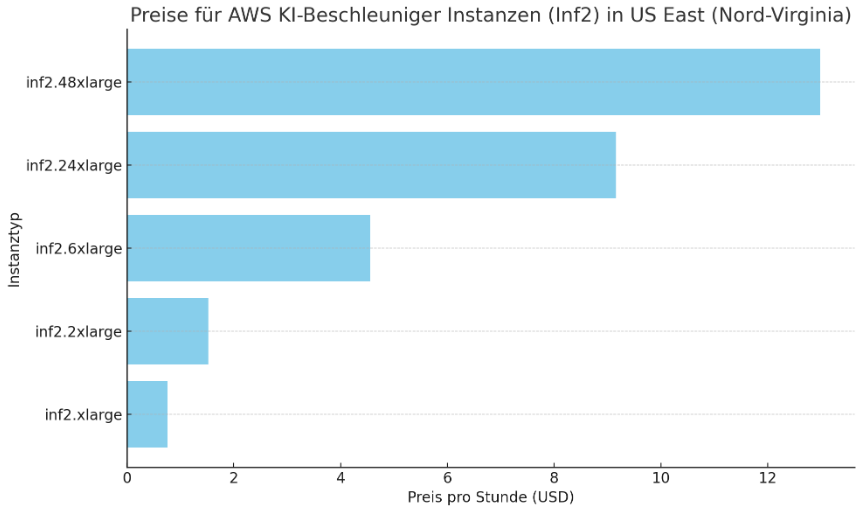 Ein Beispiel für die Preisgestaltung von Inf2-Instanzen in der AWS-Region US East (Nord-Virginia) zeigt, dass die Preise je nach Größe, Speicher und weiteren Konfigurationen variieren. In-Demand-Instanzen kosten zwischen 0,76 USD pro Stunde für eine inf2.xlarge-Instanz und 12,98 USD pro Stunde für eine inf2.48xlarge-Instanz. Es gibt auch Optionen für 1-Jahres- und 3-Jahres-Reserven, um Kosten zu senken. Kunden haben berichtet, dass die Verwendung von Inf1- und Inf2-Instanzen im Vergleich zu herkömmlichen GPU-basierten Instanzen zu erheblichen Kosteneinsparungen und Leistungssteigerungen geführt hat, einschließlich kürzerer Latenzzeiten und niedrigerer Kosten pro Inferenz.
